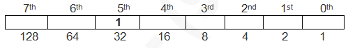 उपरोक्त चित्र में हम देख सकते हैं कि इस Byte के Bit-Pattern में 1, 2, 4, 8, 16, 32, 64 व 128 हैं, लेकिन 57 नहीं है। इस स्थिति में 57 से Just छोटा मान 32 है, इसलिए हमें Byte के Bit Pattern में इसी मान को True या 1 करना होता है, जैसाकि हमने निम्न चित्र में किया है।