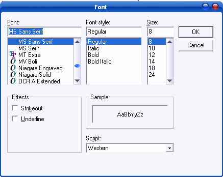 Font Property वास्तव में एक Object होता है, जिसमें इसकी स्वयं की Properties होती हैं। हम Font Object की Properties को Design Time में एक Dialog Box द्वारा Manipulate कर सकते हैं। इस Object को Call करने के दो तरीके होते हैं। पहले तरीके में हम Control की Font Property को Double Click करते हैं और दूसरे तरीके में हम Font Property के साथ में Associated Ellipsis Button ( … ) को Click करते हैं। दोनों ही स्थितियों में हमें एक Font Dialog Box दिखाई देता है।