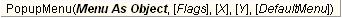 Form1.PopupMenu mnuPopup, vbPopupMenuCenterAlign Or <span style="font-weight: normal;">vbPopupMenuRightButton , , mnuPopupPrint</span>